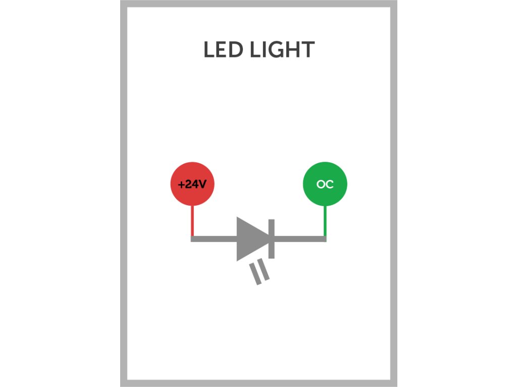 - 6 otevřených kolektorových výstupů pro přepínání LED světel na tlačítkových spínačích, maximální proud 50mA, maximální 24VDC pro každý výstup.