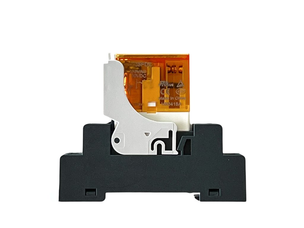 Relay 1DIN, replaceable, long-term load 12A, short-term 16A. 24VDC on the coil.