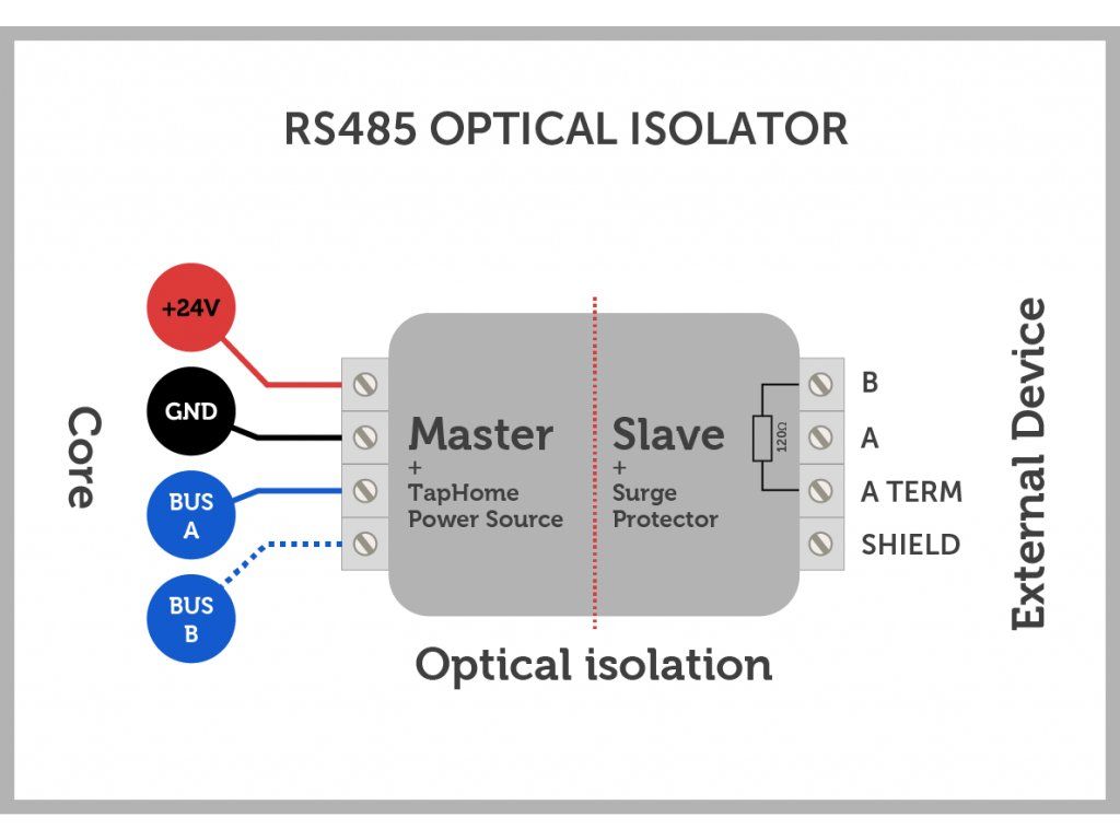 Az optikai leválasztó támogatja az RS485 hálózatok kétirányú "half-duplex" továbbítását. Az optikai leválasztó védi a TapHome vezérlőegységet, amikor a Modbus RTU-t vagy más RS485 busz eszközt csatlakoztatja hozzá. Az optikai leválasztó használata kötelező, ha az egyik feltétel teljesül: